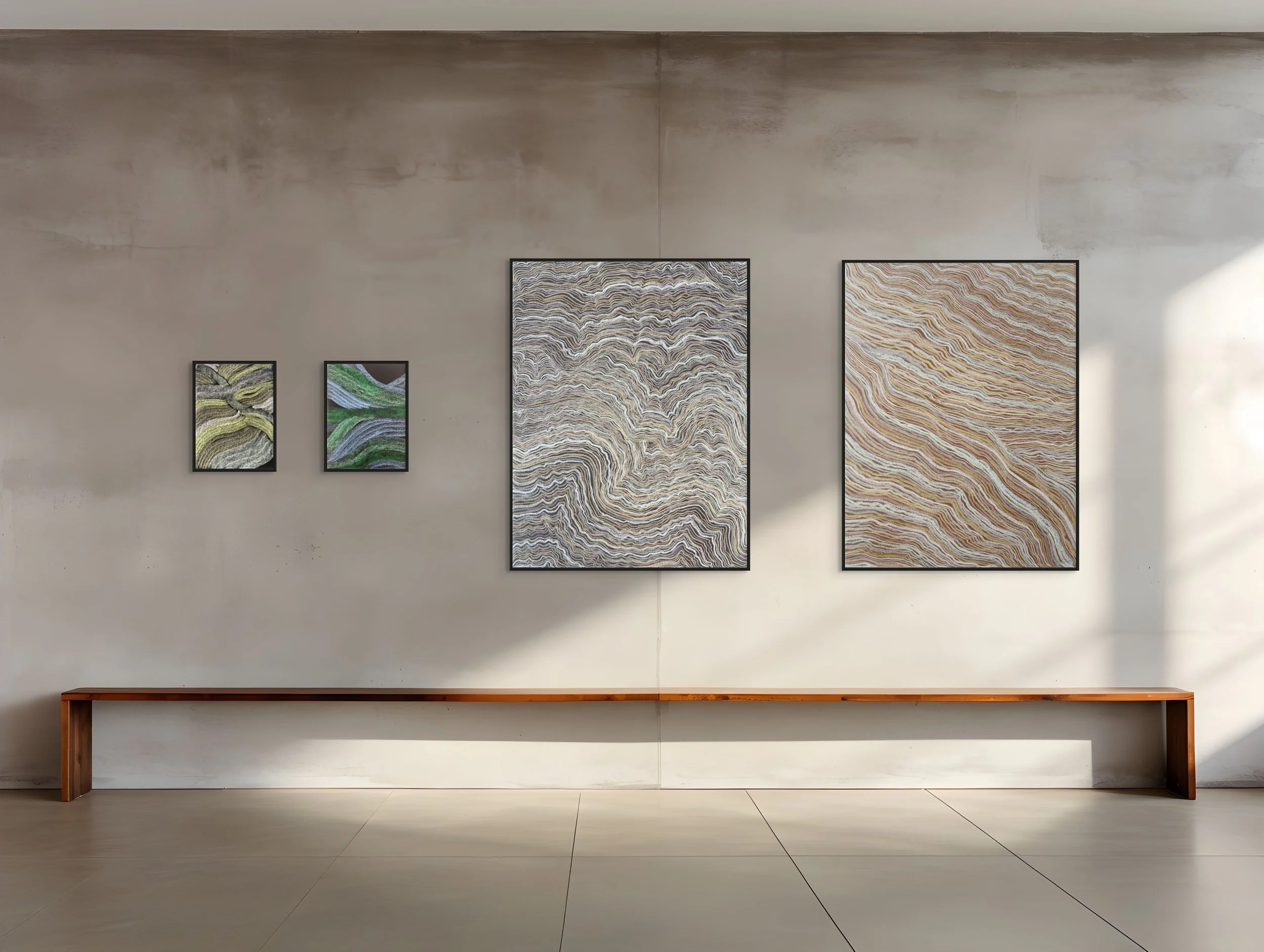 Cette composition puise son origine dans l’univers de l’art textile. Par un jeu de lignes ondoyantes, l’œuvre suggère la trame d’une étoffe en mouvement, à l’image de fils glissant sur un métier à tisser. Comme un tissage abstrait où chaque ligne conserve la mémoire du geste, cette oeuvre peut également évoquer des veinages de marbre, des strates minérales ou des territoires imaginaires.